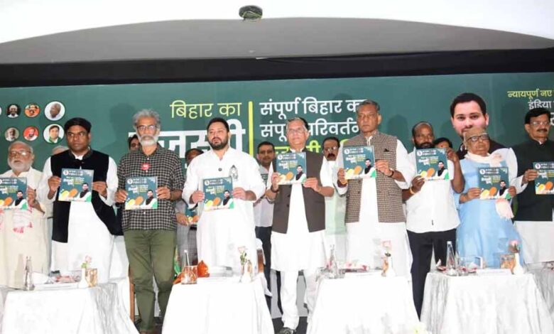 बिहार विधानसभा चुनाव से ठीक पहले महागठबंधन ने आज अपना साझा घोषणा पत्र जारी कर दिया। इसका नाम रखा गया है ‘बिहार का तेजस्वी प्रण’। इस घोषणा पत्र में युवाओं को रोजगार, महिलाओं को सम्मान और आम लोगों को राहत देने वाले कई वादे किए गए हैं। महागठबंधन ने दावा किया है कि यह घोषणा पत्र सिर्फ चुनावी वादों का पुलिंदा नहीं, बल्कि बिहार के पुनर्निर्माण की रूपरेखा है।