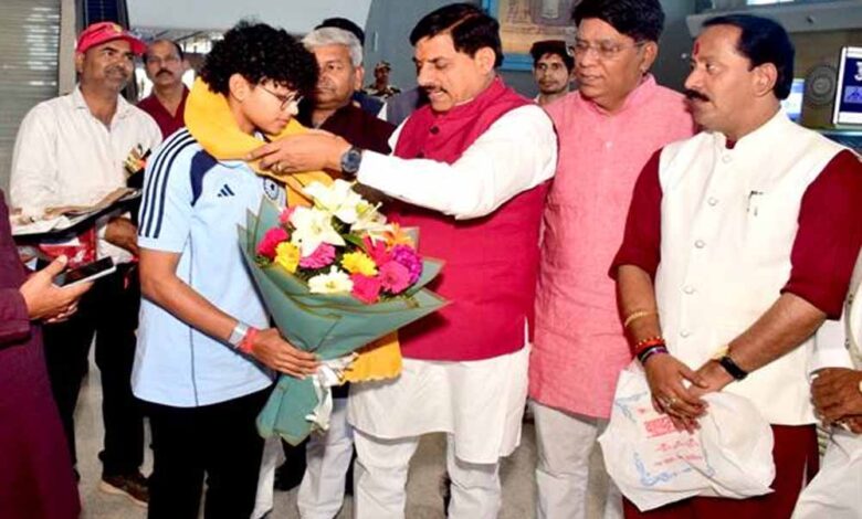 मुख्यमंत्री डॉ. मोहन यादव ने ग्वालियर की महिला क्रिकेट खिलाड़ी कु. अनुष्का शर्मा को भारतीय महिला टी-20 क्रिकेट टीम में चयन पर बधाई और शुभकामनाएँ दी हैं। मुख्यमंत्री डॉ. यादव ने कहा कि 17 अप्रैल से 27 अप्रैल 2026 तक दक्षिण अफ्रीका में होने वाली द्विपक्षीय टी-20 क्रिकेट सीरिज में ग्वालियर की अनुष्का का चयन मध्यप्रदेशवासियों के लिये गौरव की बात है। उनके चयन से मध्यप्रदेश की बेटियों को आगे बढ़ने के लिये प्रेरणा मिलेगी। मुख्यमंत्री डॉ. यादव ने अनुष्का और उनके पिता बृजमोहन शर्मा को राजमाता विजयाराजे सिंधिया विमानतल पर सम्मानित किया।