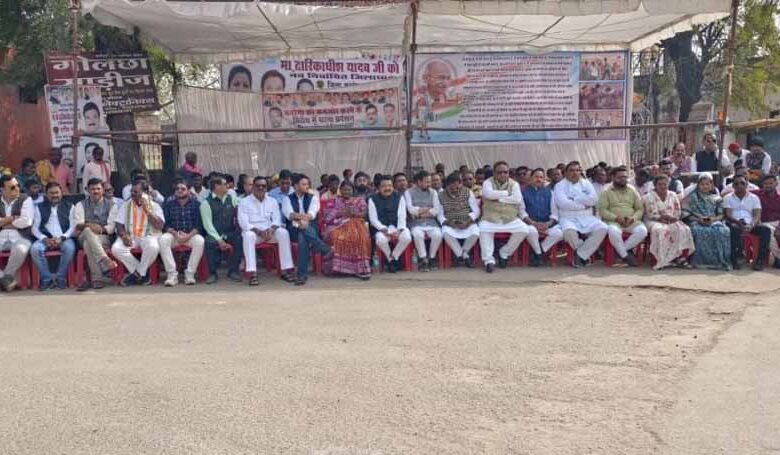 मनरेगा से राष्ट्रपिता महात्मा गांधी का नाम हटाने और नियमों में संशोधन किए जाने के विरोध में जिला कांग्रेस कमेटी द्वारा नेहरू चौक पर एक दिवसीय धरना प्रदर्शन किया गया। इस दौरान कांग्रेस कार्यकर्ताओं ने केंद्र सरकार के खिलाफ जमकर नारेबाजी की।