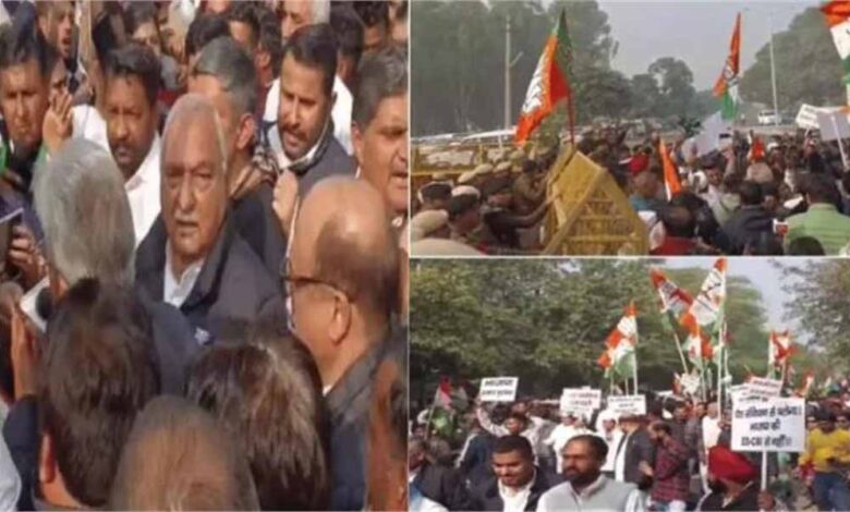 हरियाणा के पंचकूला में कांग्रेस ने BJP प्रदेश मुख्यालय के बाहर प्रदर्शन किया। पुलिस ने भाजपा दफ्तर के सामने लगाए गए बैरिकेड के बाहर ही कांग्रेसियों को रोक दिया। हरियाणा प्रदेश कांग्रेस कमेटी के आह्वाहन पर भाजपा सरकार द्वारा मनरेगा को निरस्त करने हेतु प्रस्तुत विधायक के विरोध में प्रदर्शन किया जा रहा है। पूर्व मुख्यमंत्री भूपेंद्र सिंह हुड्डा और प्रदेश अध्यक्ष राव नरेंद्र सिंह के नेतृत्व में बड़ी संख्या में कांग्रेस कार्यकर्ता सड़कों पर उतरे और भाजपा के क्षेत्रीय कार्यालय़ का घेराव करने के लिए कूच लिया।