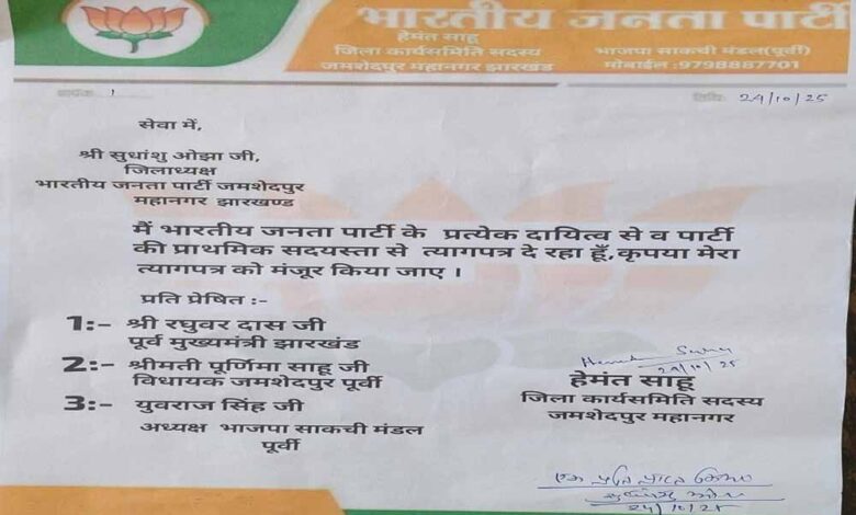 साहू ने अपना त्यागपत्र भाजपा जमशेदपुर महानगर के जिलाध्यक्ष सुधांशु ओझा को सौंपा है। पत्र में उन्होंने लिखा है कि वे पार्टी के प्रत्येक दायित्व और प्राथमिक सदस्यता से त्यागपत्र दे रहे हैं और उनके इस्तीफे को स्वीकार किया जाए। हेमंत साहू ने अपने त्यागपत्र में इस्तीफे का कोई विशेष कारण नहीं बताया है। वहीं, पार्टी नेतृत्व की ओर से इस पर अब तक कोई आधिकारिक प्रतिक्रिया नहीं दी गई है।